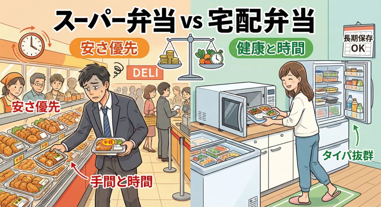 手軽で安い「スーパーの弁当」と、栄養満点で時短ができる「宅配弁当」。どちらも便利ですが、実は得られるメリットは全く異なります。