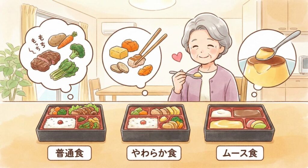 宅配弁当選びで最も重要なのは、親御さんの「噛む力(咀嚼)」や「飲み込む力(嚥下)」に合った食事形態を選ぶことです。
