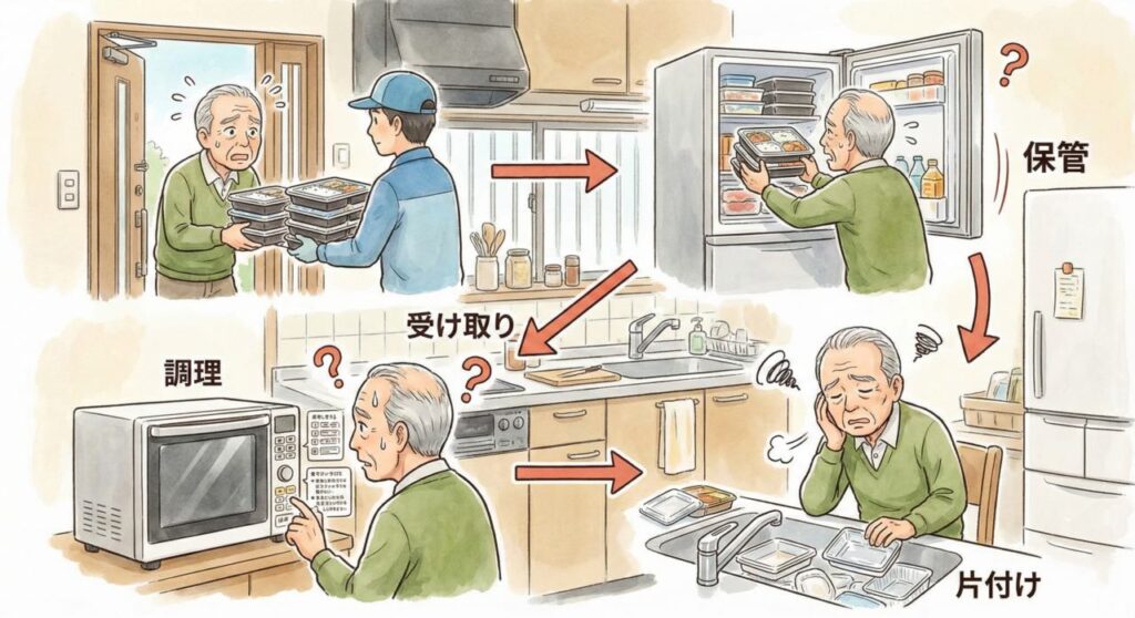 高齢の親御さんにとって、荷物を受け取り、冷凍庫にしまい、レンジで温め、ゴミを分別して捨てる…という一連の動作は、私たちが想像する以上に重労働です。