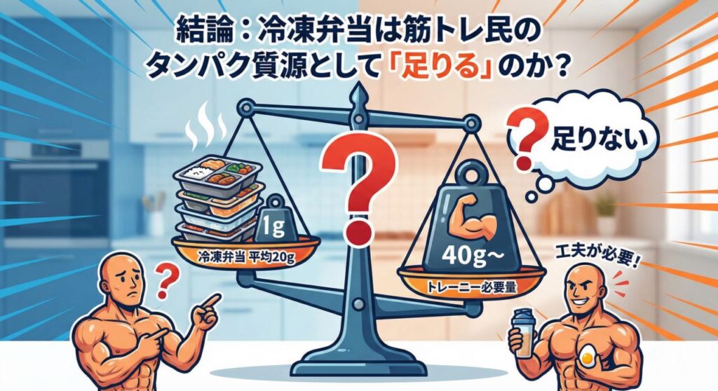 - 結論: 体重60kg以上のトレーニーには、冷凍弁当単体(約20g)ではタンパク質不足。
