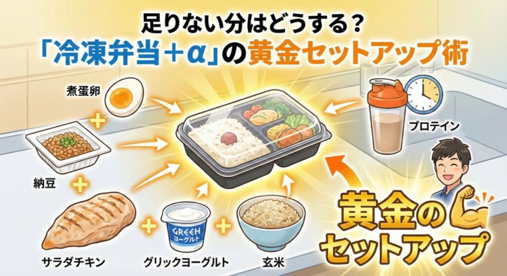 しかし、だからといって「使えない」と判断するのは早計です。むしろ、「足りない分をどう補うか」という戦略さえ持てば、冷凍弁当は最強の時短バルクアップツールに化けます。
