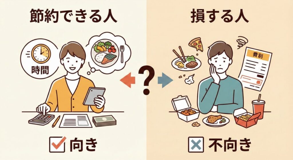 | 節約になる人 | ・週3回以上コンビニ弁当や外食を利用する ・野菜や肉を使いきれず腐らせることがある ・「買い物+調理+片付け」の時間を時給換算すると高い | 食費ダウン&時間創出 (無駄な出費と労働が減る) |