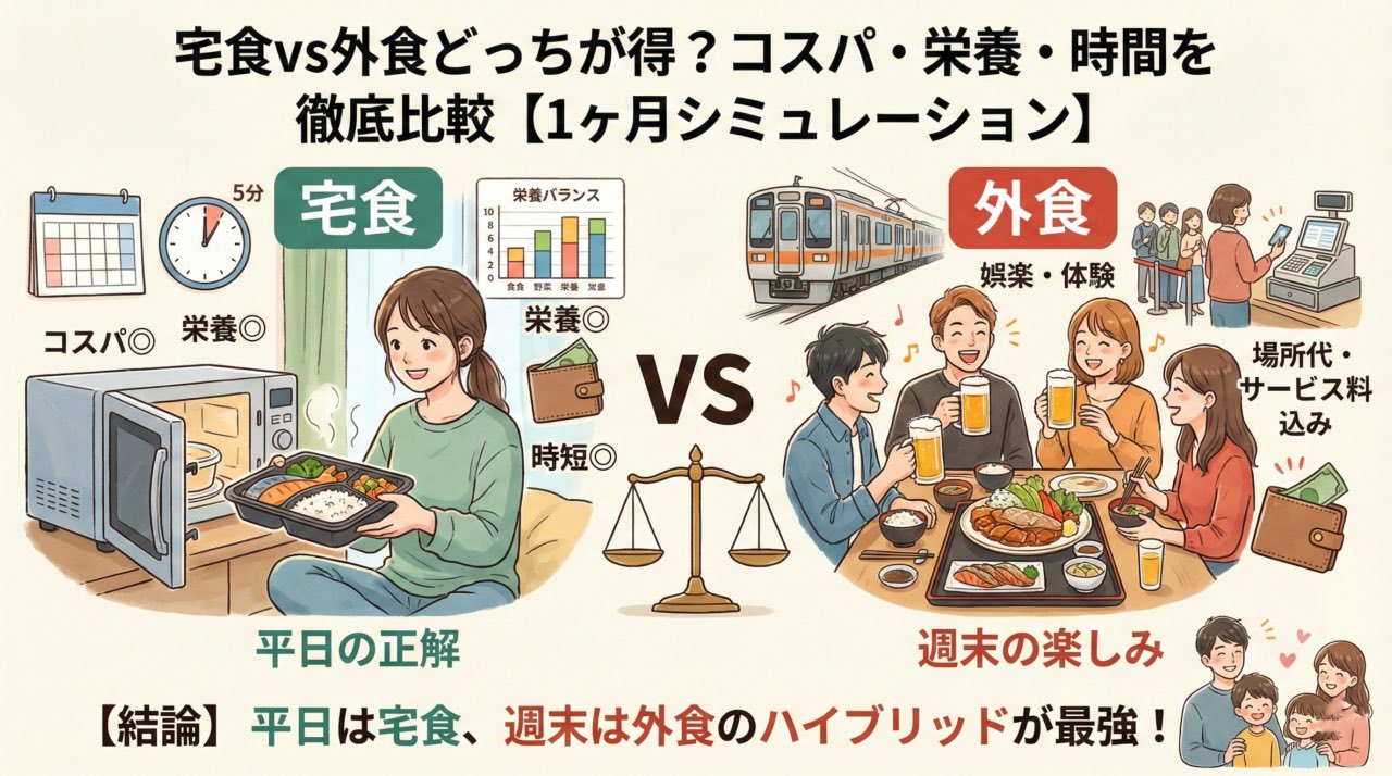 結論から言うと、平日の夕食など「栄養摂取」が目的なら宅食、週末の友人との食事など「娯楽・体験」が目的なら外食を選ぶのが最も賢い選択です。